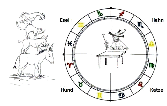 Im Märchen hat der Esel eine tragende und in Bezug auf die ihm folgenden Tiere auch eine führende Stellung. In jungen Jahren diente er dem Müller und schleppte geduldig die Mehlsäcke. Das Mehl kann erst dann gemahlen werden, nachdem die Spreu vom Weizen getrennt wurde. Das Brot, das unseren Leib nährt und stärkt, muß im Ofen gebacken werden, d.h. bildlich durchs Feuer gehen. Der unbarmherzige Müller möchte das alt gewordene Tier und in seinen Augen nun nutzlose Wesen "aus dem Futter" schaffen, anstatt es liebevoll bis zum Tode zu begleiten. Doch der Esel entzieht sich diesem Ansinnen.