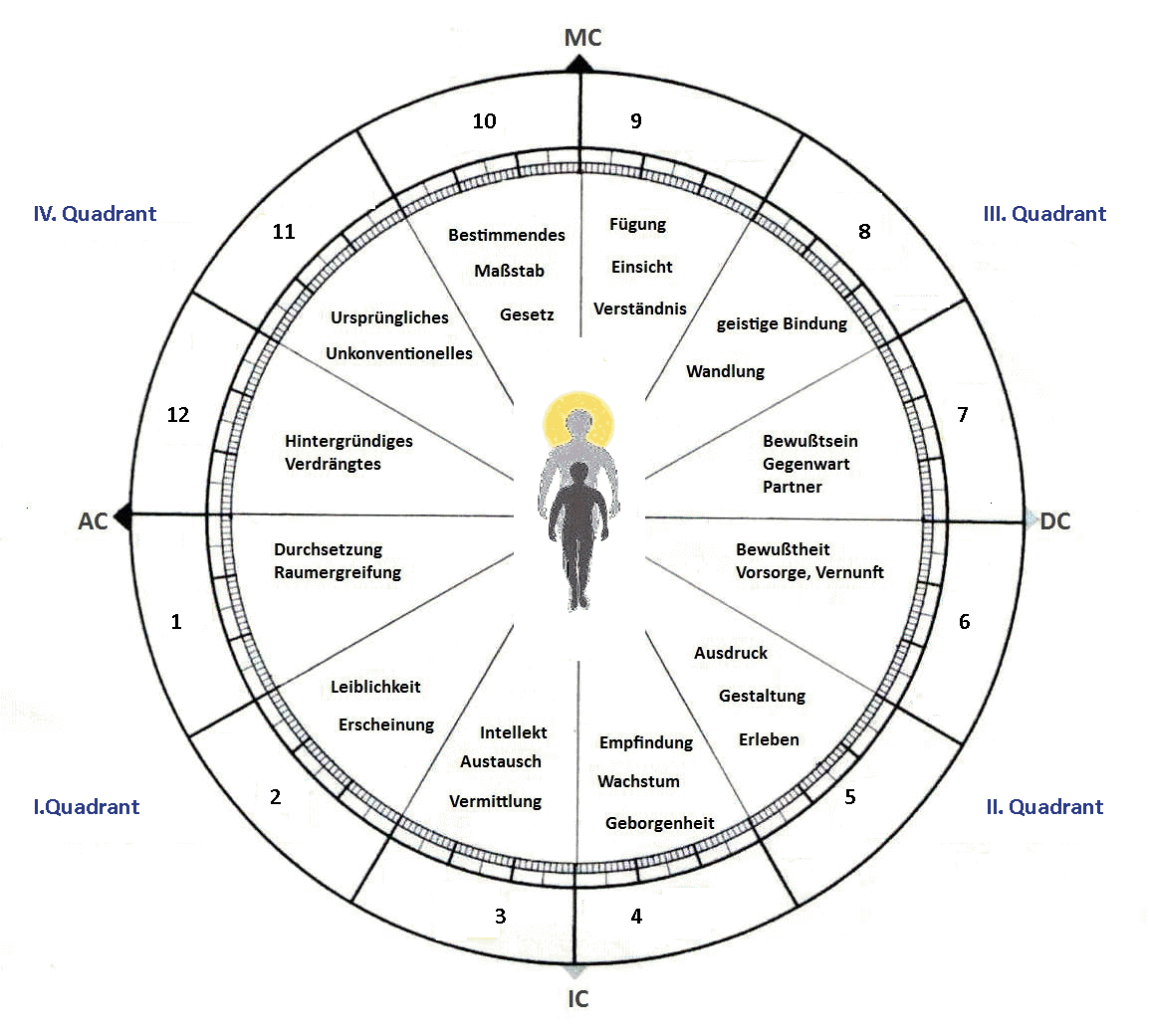 Dabei ist es gleichzeitig so eingerichtet, daß die Körperfunktionen (1.Quadrant) von oben veranlaßt werden: der Herzschlag und die Verdauung beispielsweise funktionieren ohne unser Zutun. Die Krankheiten haben etwas mit der Seele zu tun, deren Bereich dem 2. Quadranten zugeordnet wird. Alles, was seelisch unverdaut bleibt, wird langfristig in körperliche Erkrankungen führen müssen. Der erste Quadrant beginnt mundan mit dem männlichen Feuerzeichen Widder, der zweite Quadrant mit dem weiblichen Wasserzeichen Krebs: auf die nach außen gerichtete Raumergreifung folgt das nach innen gerichtete Fruchtwachstum und in der Entsprechung die innere seelische Reifung. In der Gegenrichtung kommen dem Menschen dabei aus dem "Meer der Möglichkeiten" (Fische) die schicksalhaften Begebenheiten in der Außenwelt entgegen. Die beiden Strömungen treffen sich an der Grenze von Haus 6 zu Haus 7 (entsprechend Jungfrau-Waage) als gerade gegenwärtige Situation.