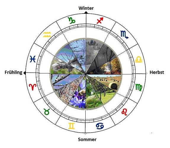 Diese Anordnung des Jahreskreises orientiert sich an der astrologisch üblichen Häusereinteilung. Hervorgehoben sind die vier Wendepunkte im Sonnenverlauf, der Beginn der Kardinalzeichen an den Tag- und Nachtgleichen im Frühling und Herbst und die Sonnenwenden bei 0° Krebs bzw. 0° Steinbock. Die Zeitabschnitte, die sich im Jahreskreis gegenüberliegen stellen polare Gegensätze dar.
