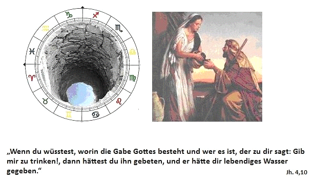 Wasser ist die reale Entsprechung für Zeit: die Zeit fließt und entspringt gleichzeitig aus verborgenen Höhen. Dies zeigt auch die Ikone von Shiva als Ardhanrishvara auf. Von Shiva heißt es, er würde die wilde Ganga zähmen. Seine Partnerin ist Parvati, die "Tochter der Berge". Der Ganges ist den Hindus heilig, wie der Jordan den Juden und Christen. Jordan bedeutet sinngemäß "herabsteigender Fluß". An seinem Ufer rief der Täufer zur Umkehr auf und tauchte zusammen mit dem Heiland ein. Die Wasser bündeln sich zu Strömen und fließen ins Meer. Gleichzeitig steigen sie auf und regnen dann wieder herab, um die Erde zu befruchten oder sich als als Grundwasser zu sammeln. Quellen und Brunnen gehören beide zur Krebsanalogie und spiegeln sich über die MC-IC-Achse des Horoskops. An dieser Achse begegnen sich Mann und Frau, männlicher und weiblicher Aspekt des Menschen, aber auch Geschöpf und Schöpfer. Die beiden Nachkommen des Stammvaters Abrahams, Isaak und Jakob, finden ihre späteren Ehefrauen an einem Brunnen. Auch Jesus bittet eine Frau, eine Samariterin, um Wasser.